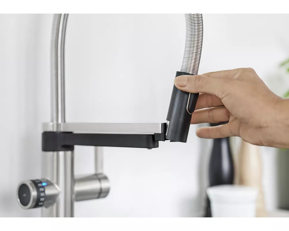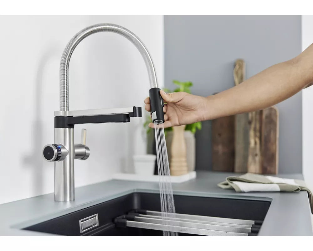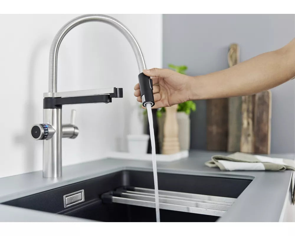 Dlaczego warto zainwestować w Baterię BLANCO EVOL-S Pro? Ta elegancka bateria łączy w sobie wodę zimną, ciepłą oraz przefiltrowaną, co sprawia, że idealnie dopasowuje się do Twoich potrzeb. Dzięki innowacyjnemu przełącznikowi i czujnikowi dotykowemu Click&Touch, dostosujesz ilość przefiltrowanej wody w mgnieniu oka. Nigdy więcej zmarnowanej wody!