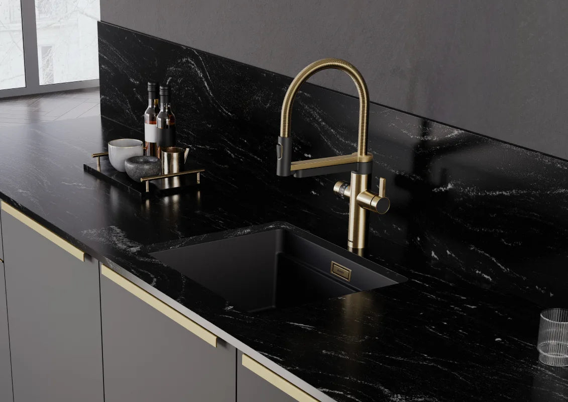 Innowacyjny system 5-w-1: Bateria kuchenna, która dostarcza wodę zimną, ciepłą, schłodzoną, średnio mineralizowaną oraz gazowaną. To kompletne rozwiązanie dla nowoczesnej kuchni, które eliminuje konieczność kupowania wody butelkowanej.
