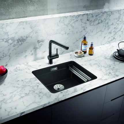 Zlewozmywak granitowy jednokomorowy BLANCO ETAGON 500-F to nie tylko piękno – to komfort pracy, który docenisz każdego dnia. Wyobraź sobie, że warzywa, owoce czy naczynia wygodnie spływają bez wysiłku na odpowiednie miejsce, a solidna komora wytrzymuje najwyższe temperatury bez utraty blasku. Ta harmonia wyrafinowanego designu i funkcjonalności sprawia, że gotowanie staje się przyjemnością, a kuchnia prawdziwą przestrzenią relaksu i wyrafinowania.