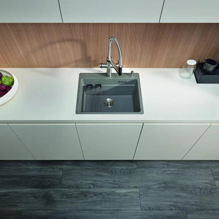 Minimalistyczny i nowoczesny charakter zlewozmywaka jednokomorowego granitowego BLANCO ETAGON 6-F harmonijnie wpisuje się w luksusowe wnętrza. Montaż na równi z blatem tworzy gładką, spójną powierzchnię, która nie tylko ułatwia utrzymanie czystości, ale także nadaje kuchni szlachetny i dopracowany wygląd. Kolor wulkaniczny szary to subtelna paleta zmysłowo łącząca naturalność granitu z wyrafinowaniem nowoczesnego designu.