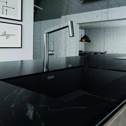 Zlew kuchenny w kolorze ciemnego stali przykuwa wzrok swoim efektownym, prostokątnym kształtem i niepowlekaną powierzchnią ze stali szlachetnej najwyższej jakości. Dzięki temu zlewozmywak jest przyjemnie ciepły w dotyku, co dodaje mu wyjątkowej klasy i komfortu podczas codziennego użytkowania. Wyjątkowa struktura powierzchni ułatwia czyszczenie – znikają odciski palców i zabrudzenia, co pozwala zachować nienaganny wygląd przez lata.