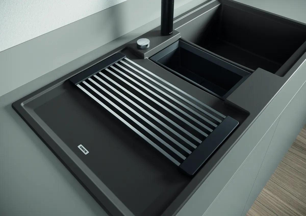 W zestawie znajdziesz matę uniwersalną wykonaną ze stali nierdzewnej i silikonu, oryginalny durszlak Blanco oraz wysokiej jakości pokrętło korka automatycznego – wszystko zaprojektowane tak, by każdy element podkreślał ekskluzywny charakter produktu.